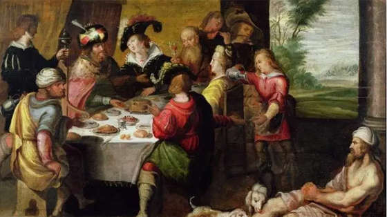 Trong câu chuyện này, Lu-ca sẽ khéo léo chuyển từ chủ đề tiền bạc sang chủ đề công lý bằng cách mô tả hai con người hoàn toàn trái ngược nhau : một người giàu có và một người nghèo khó ; một người “mặc toàn lụa là gấm vóc, ngày ngày yến tiệc linh đình”, và một người “mụn nhọt đầy mình, thèm được những thứ trên bàn ăn của ông ấy rớt xuống mà ăn cho no” ; một người thuộc một tầng lớp xã hội cao trọng và một người thì đói kém, đầy thương tích và chỉ có những con chó làm bạn. Người giàu được hưởng bao của cải, địa vị xã hội, tiệc tùng… trong khi người nghèo chỉ nhận bao lời nguyền rủa, sống đói kém.