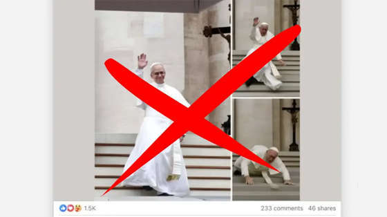 Những bức ảnh giả mạo ở trên được tạo bằng trí tuệ nhân tạo (AI) cho thấy Đức Giáo hoàng Lêô XIV dường như bị ngã trên bậc tam cấp bên ngoài Vương cung thánh đường Thánh Phêrô đã lan truyền trên mạng vào tháng 6.