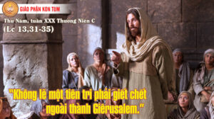 Cũng vào giờ ấy, có mấy người Pha-ri-sêu đến thưa Đức Giê-su rằng: “Xin ông đi ra khỏi đây, vì vua Hê-rô-đê đang muốn giết ông!”. Người bảo họ: “Các ông hãy đi nói với con cáo ấy thế này: “Hôm nay và ngày mai tôi trừ quỷ và chữa lành bệnh tật, ngày thứ ba tôi hoàn tất. Tuy nhiên, hôm nay, ngày mai và ngày mốt, tôi phải tiếp tục đi, vì một ngôn sứ mà chết ngoài thành Giê-ru-sa-lem thì không được.