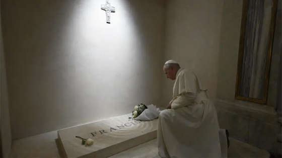 Đức Thánh cha Lêô XIV đã quỳ xuống và đặt một bó hoa hồng trắng trên ngôi mộ bằng đá cẩm thạch. Đây là một lời tri ân dành cho vị tiền nhiệm của ngài, được chôn cất cạnh Nhà nguyện Phaolô, nơi lưu giữ bức ảnh Salus Populi Romani (Đức Mẹ là Phần rỗi của dân thành Roma) mà Đức cố Giáo hoàng Phanxicô thường xuyên kính viếng trước và sau mỗi chuyến công du quốc tế hoặc nằm viện.