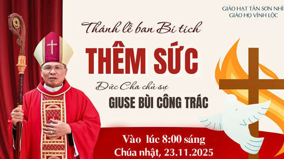 Thánh lễ  Ban Bí tích thêm sức tại Giáo họ Vĩnh Lộc, chủ tế Đức Cha Giuse Bùi Công Trác. Lúc 08giờ00 Chúa nhật ngày 23.11.2025. tại Giáo họ Vĩnh Lộc. Được trực tiếp để phục vụ: Bệnh nhân, những người đau yếu, tản tật không thể đến nhà thờ được! Kính mời quý anh chị cùng hiệp thông cầu nguyện.