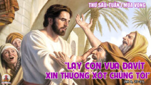 Khi ấy, Chúa Giêsu đi ngang qua, có hai người mù chạy theo Chúa và kêu lớn tiếng rằng: “Hỡi Con vua Đavít, xin thương chúng tôi”. Khi Chúa tới nhà, những người mù tiến lại gần Chúa. Chúa Giêsu phán bảo họ: “Các ngươi có tin rằng Ta có thể làm việc ấy không?” Họ thưa: “Lạy Thầy, có”. Bấy giờ Chúa sờ vào mắt họ và phán: “Các ngươi tin thế nào, thì hãy được như vậy”. Mắt họ liền mở ra, nhưng Chúa Giêsu truyền cho họ rằng: “Coi chừng, đừng cho ai biết”. Nhưng vừa ra đi, họ liền đồn tiếng Người trong khắp miền ấy.
