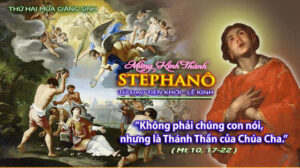 2.Suy niệm: Khi đặt lễ kính thánh Stêphanô tử đạo liền sau lễ Giáng Sinh, Giáo hội có ý loan báo về con đường cứu thế của Chúa Giêsu. Thiên Chúa đã làm người để mang lại bình an cho nhân loại, như ánh sáng đã đến thế gian để xua tan bóng đêm của sự chết. Và con đường đi đến sự sống vĩnh cửu là con đường thập giá. Hơn ai hết, thánh Stêphanô đã sống điều này một cách triệt để khi dám đem cả mạng sống mình để minh chứng cho một niềm tin và chân lý. Còn chúng ta, vì lợi ích riêng, vì sợ thiệt thòi nên chúng ta thinh lặng thay gì nói sự thật để làm chứng về Đức Kitô Con Thiên Chúa.
