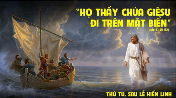 (Khi năm ngàn người đã được ăn no), Chúa Giêsu liền giục các môn đệ xuống thuyền, qua bờ bên kia trước mà đến Bếtsaiđa, đang khi Người giải tán dân chúng. Giải tán họ xong, Người lên núi cầu nguyện. Chiều đến, thuyền đã ra giữa biển, còn Người thì một mình ở trên đất. Khoảng canh tư đêm tối, Người thấy họ khó nhọc chèo chống vì ngược gió, Người đi trên mặt biển mà đến với họ, và Người muốn vượt qua trước họ. Họ thấy Người đi trên mặt biển, thì tưởng là ma, nên la hoảng lên. Vì ai nấy đều thấy Người và hoảng hốt, nên Người liền lên tiếng bảo họ rằng: “Hãy yên trí, chính Thầy đây, đừng sợ”. Rồi Người lên thuyền họ, và gió im lặng. Tâm hồn họ lại càng sửng sốt hơn, vì họ chưa hiểu gì về vấn đề bánh: lòng họ còn mù tối.