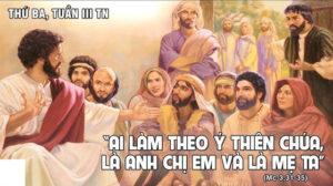 Khi ấy, mẹ Chúa Giêsu và anh em Người đến và đứng ở ngoài, sai người vào mời Chúa ra. Bấy giờ có đám đông ngồi chung quanh Người và họ trình Người rằng : “Kìa mẹ và anh em Thầy ở ngoài kia đang tìm Thầy”. Người trả lời rằng : “Ai là mẹ Ta ? Ai là anh em Ta ?” Rồi đưa mắt nhìn những người ngồi vòng quanh, Người nói : “Đây là mẹ Ta và anh em Ta. Vì ai làm theo ý Thiên Chúa, thì người ấy là anh chị em và là mẹ Ta”.