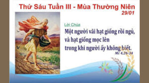 2.Suy niệm: Những lời sống động từ chính miệng Chúa Giêsu phán ra có một sức mạnh tự bản chất. Giống như hạt giống, Lời Chúa vẫn âm ỉ trong lòng người nghe. Sức mạnh của Lời Chúa vẫn hằng tác động trên mỗi con người. Như thế không phải ta tự sức mình mà có thể đón nhận Lời Thiên Chúa nhưng là chính Lời Chúa tác động trên mỗi người chúng ta. Biết được điều này để chúng ta vững tin vào Chúa hơn, cũng như để Lời Chúa hành động trong chúng ta. Nước Thiên Chúa là một thực tại lớn lao cho dù hiện tại chỉ là một tiểu số bé nhỏ. Với sức mạnh của Lời Chúa thì Nước Thiên Chúa sẽ trở thành nơi nương náu cho các dân tộc.