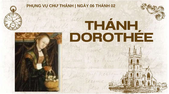 Thánh Dorothée (còn được gọi là Thánh Dorothy) là một thiếu nữ sống vào cuối thế kỷ III, tại Césarée thuộc miền Cappadoce, vùng Tiểu Á, nơi một trong những cộng đoàn Kitô hữu đầu tiên phát triển mạnh. Dorothée là Kitô hữu từ thuở nhỏ, ngài nổi tiếng với những giờ cầu nguyện kéo dài, việc hy sinh chay tịnh và các việc bác ái dành cho tha nhân.