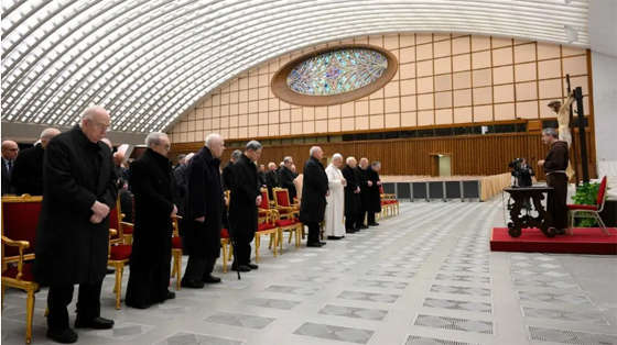 Tiếng ồn ào của các cuộc chiến tranh tàn phá thế giới đã vang đến tận Hội trường Paul VI, nơi Cha Roberto Pasolini, nhà giảng thuyết của Phủ Giáo hoàng, đã trình bày, trước sự hiện diện của Đức Giáo hoàng, bài suy niệm đầu tiên trong bốn bài suy niệm về chủ đề: “Sự hoán cải. Bước theo Chúa Giêsu trên con đường khiêm nhường.” Những bài suy niệm này, sẽ được tổ chức vào mỗi thứ Sáu cho đến ngày 27/3, trước khi bắt đầu Tuần Thánh, có chủ đề xuyên suốt: “Cho nên, phàm ai ở trong Đức Kitô đều là thụ tạo mới (2 Cr 5, 17). Hoán cải trở về với Tin Mừng theo Thánh Phanxicô.”