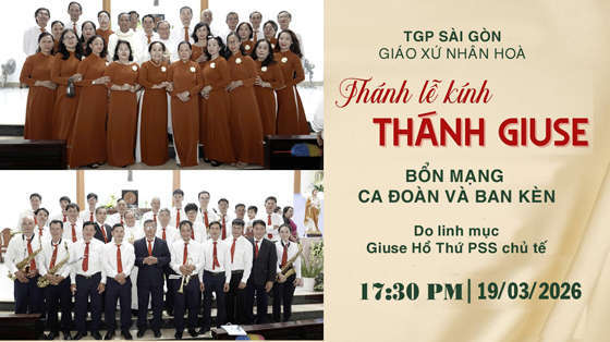 Thánh lễ kính Thánh Giuse “BỔN MẠNG CA ĐOÀN VÀ BAN KÈN” . Lúc 17giờ30 ngày 19.03.2026. tại Giáo xứ Nhân Hoà. Để phục vụ: Bệnh nhân, những người đau yếu, tản tật không thể đến nhà thờ được! Kính mời quý anh chị cùng hiệp thông cầu nguyện.