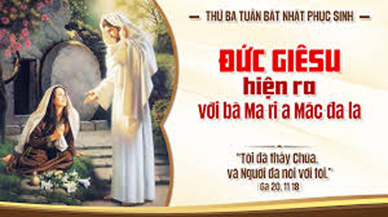 2.Suy niệm:  Gặp được Chúa, chắc chắn bà Maria Macđala rất vui mừng. Nhưng để đến được niềm vui này, bà đã trải qua một nỗi u buồn tuyệt vọng. Theo Chúa, chắc chắn bà đã cùng với các môn đệ chứng kiến nhiều phép lạ, nhưng rồi tất cả đều tan biến khi mà chính bà chứng kiến cái chết tủi nhục của Chúa trên thập giá, và cuối cùng, bà không còn nhìn thấy xác Chúa ở trong mồ nữa. Như vậy, tất cả chỉ là tuyệt vọng trong nước mắt. Nhưng chính trong sự tuyệt vọng, bà được thấy Chúa Phục Sinh và Người đã gọi tên bà một cách thân mật, ngọt ngào. Từ đó, bà hân hoan vui mừng đi vào cuộc sống mới là làm chứng nhân cho Người.