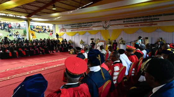Tôi rất vui mừng được ngỏ lời với anh chị em tại Đại học Công giáo Trung Phi này, một nơi xuất sắc cho việc nghiên cứu, truyền bá kiến thức và đào tạo bao thế hệ trẻ. Tôi bày tỏ lòng biết ơn đối với các cấp lãnh đạo nhà trường vì sự đón tiếp nồng hậu và vì sự dấn thân không ngừng của họ cho sự nghiệp giáo dục. Thật là một niềm hy vọng khi tổ chức này, được thành lập năm 1989 bởi Liên hiệp các Hội đồng Giám mục Trung Phi, đã trở thành một ngọn hải đăng phục vụ Giáo hội và châu Phi trong công cuộc tìm kiếm chân lý, thúc đẩy công lý và tình đoàn kết.