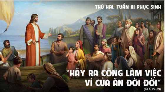 Khi gặp Người ở bờ biển bên kia, họ nói với Người: “Thưa Thầy, Thầy đến đây bao giờ?” Chúa Giêsu đáp: “Thật, Ta bảo thật các ngươi, các ngươi tìm ta không phải vì các ngươi đã thấy những dấu lạ, nhưng vì các ngươi đã được ăn bánh no nê. Các ngươi hãy ra công làm việc không phải vì của ăn hay hư nát, nhưng vì của ăn tồn tại cho đến cuộc sống đời đời, là của ăn Con Người sẽ ban cho các ngươi. Người là Ðấng mà Thiên Chúa Cha đã ghi dấu”. Họ liền thưa lại rằng: “Chúng tôi phải làm gì để gọi là làm việc của Thiên Chúa?” Chúa Giêsu đáp: “Ðây là công việc của Thiên Chúa, là các ngươi hãy tin vào Ðấng Ngài sai đến”.