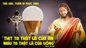 2.Suy niệm:  Bài Tin Mừng hôm nay nhấn mạnh về ý tưởng ăn Thịt và uống Máu Đức Giêsu. Điều này làm ta liên tưởng ngay đến Bí Tích Thánh Thể. Chính Đức Giêsu đã tự hiến làm hy tế, thân xác \Người chịu chết treo trên Thập Giá, để chuộc tội cho nhân loại, và Máu Người đổ ra để đem lại sự sống đời đời cho chúng ta. Vì thế, với niềm tin chúng ta hãy năng lẵng nhận Bí Tích Thánh Thể. Vì khi đo, chúng ta sẽ được nuôi dưỡng bằng chính con người sống động và bất khả chia của Đức Giêsu dưới hy tế Thịt và Máu Chúa. Chính nhờ hy tế này mà chúng ta được sống đời đời và sống vào ngày sau hết.