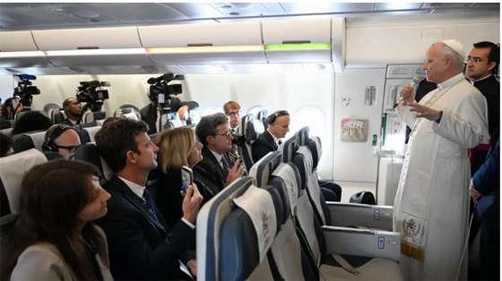 Nhà báo Arthur Herlin (Paris Match): Thưa Đức Thánh Cha, chúng con hết sức cảm ơn ngài vì chuyến đi phi thường này. Thật tuyệt vời. Trong chuyến đi này, ngài đã gặp một số nhà lãnh đạo độc đoán nhất thế giới. Làm sao ngài tránh để sự hiện diện của mình trao cho các chế độ ấy một thẩm quyền luân lý? Có phải, nói theo cách nào đó, đây là một kiểu “tẩy trắng hình ảnh” nhờ Đức Giáo hoàng hay không?