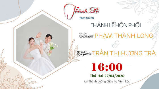 Trực tiếp: Lễ thành hôn “Vincent THÀNH LONG – Maria HƯƠNG TRÀ” lúc 16:00 ngày 27/04/2026 27/04/2026 admin Thánh lễ trực tuyến, Tin mới cập nhật, Video, Video trang Home 0 Nhấn vào để xem thêm thông tin chi tiết Trực tiếp: Lễ thành hôn "Vincent THÀNH LONG - Maria HƯƠNG TRÀ" lúc 16:00 ngày 27/04/2026